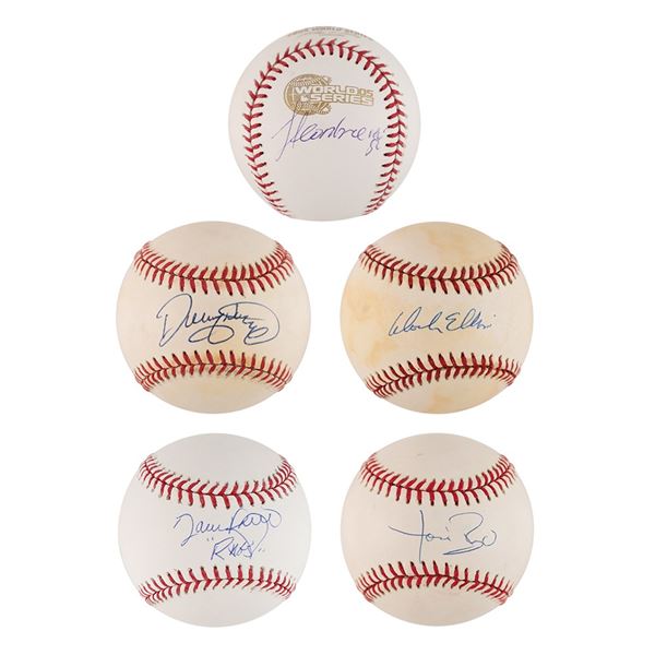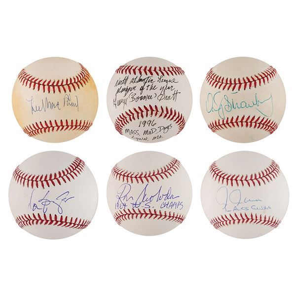 Six baseballs, including official Rawlings baseballs and a Wilson baseball, each signed by a noteworthy baseball player or executive. Signers are: Lee