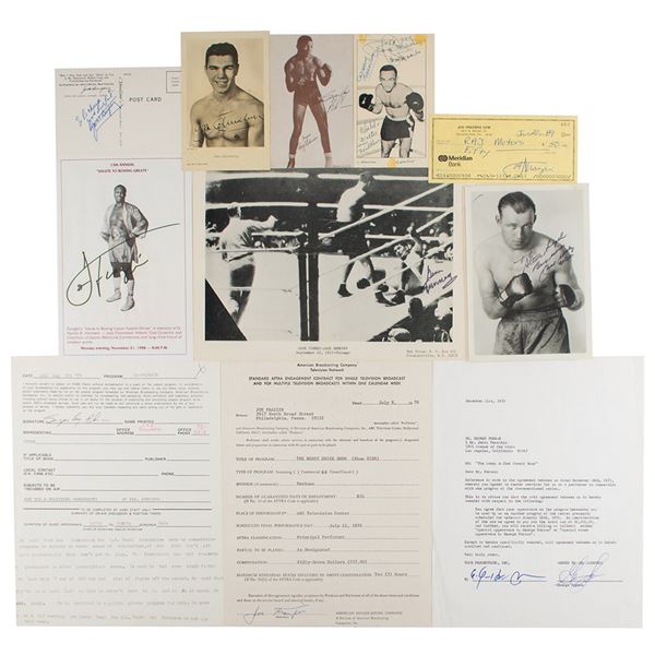 Group of 11 items signed by boxers, including: Max Schmeling (SP), Jack Dempsey (postcard), Joe Frazier (DS, check, and program), George Foreman (DS),