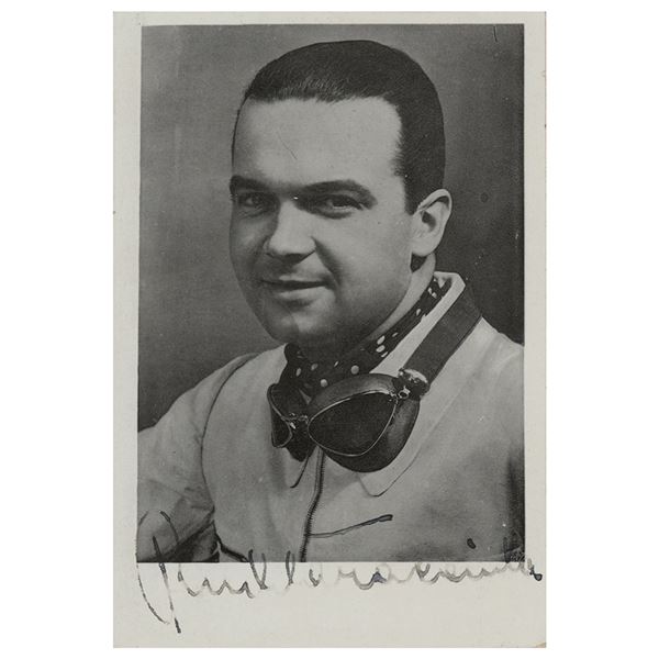 Uncommon 3.5 x 5.5 postcard photo of Caracciola in his racing suit and goggles, signed at the bottom in fountain pen. In fine condition, with some ski