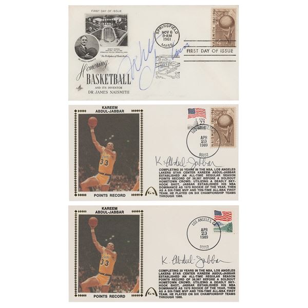 Three covers signed by the Lakers stars: an FDC with a cachet honoring basketball's inventor James A. Naismith, signed in blue ballpoint by Wilt...