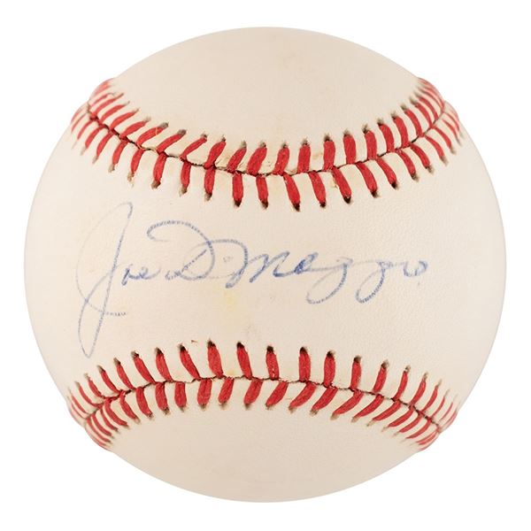 Official Rawlings American League (Brown) baseball signed in blue ballpoint on the sweet spot, "Joe DiMaggio." In fine condition.