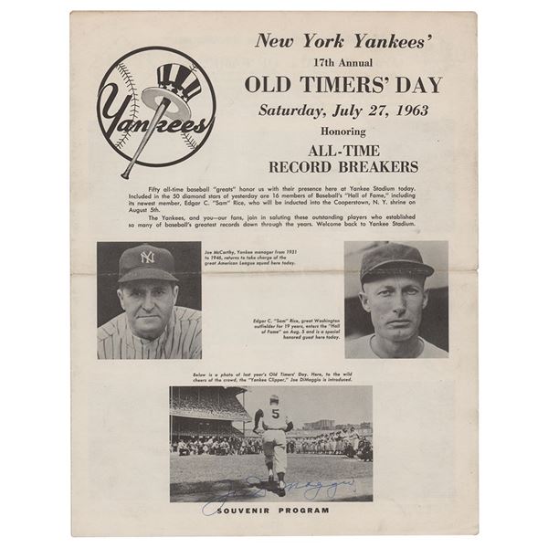 Program for the New York Yankees' 17th Annual Old Timers' Day on July 27, 1963, two pages, 8.5 x 11, signed on the front in blue ballpoint b...