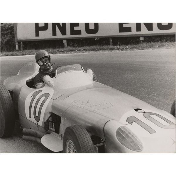 Vintage glossy 9 x 6.5 photo of Fangio in his iconic Mercedes-Benz W196 race car, signed in black ballpoint, "J. M. Fangio." In fine condi...