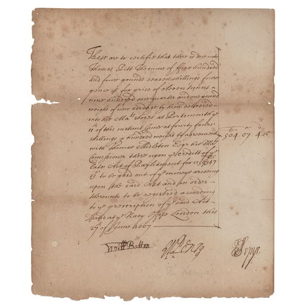 Manuscript DS, one page, 7.5 x 9, June 27, 1667. Document authorizing the payment of 504 pounds for cordage shipped to the Navy at Portsmouth, in part