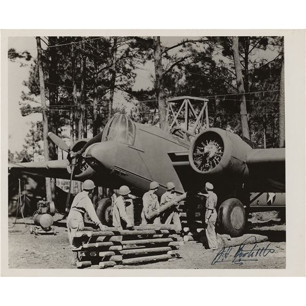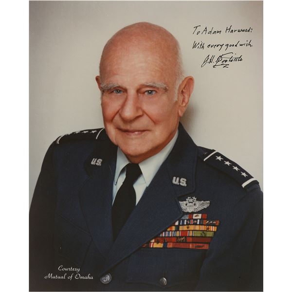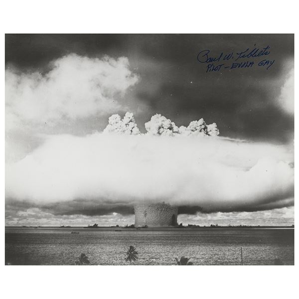 Glossy 8 x 10 photo of the mushroom cloud over Hiroshima, signed in black felt tip, "Paul Tibbets, Pilot. B29 Enola Gay, 6 Aug. 1945." In ...