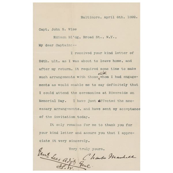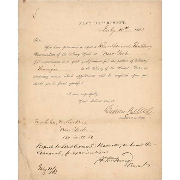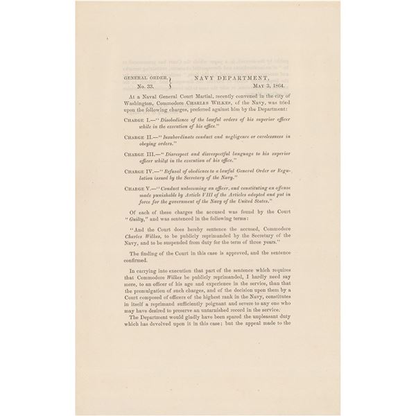 Unsigned printed Navy Department document, one page both sides, 5.5 x 8.5, May 3, 1864, regarding results of the court-martial of Commodore Charles Wi