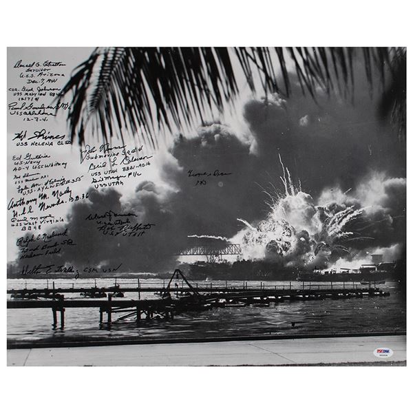 Satin-finish 20 x 16 photo of the infamous 1941 attack on Pearl Harbor, signed in black felt tip by 17 survivors, most adding their ranks and assignme