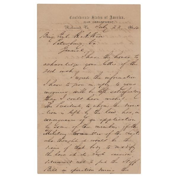 Civil War-dated LS, three pages on two adjoining sheets, 4.75 x 7.75, Confederate States of America, War Department letterhead, July 22, 1864. Letter