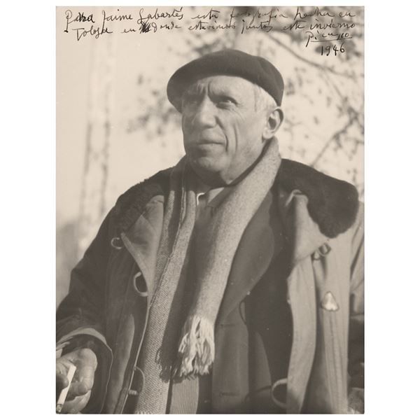 Vintage matte-finish 7 x 9.25 photo of Picasso bundled up for chilly weather, signed and inscribed in fountain pen to his best friend, the Spanish scu