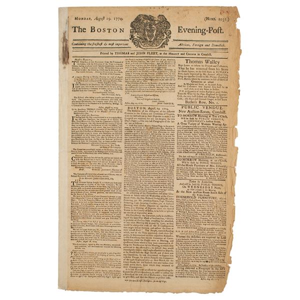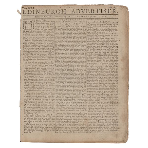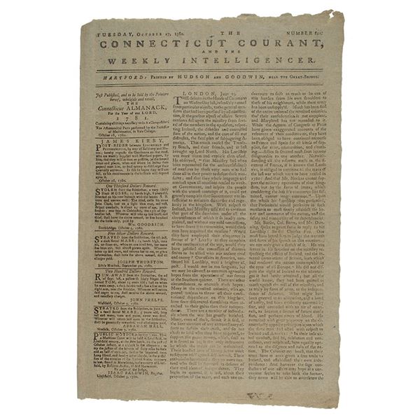 The Connecticut Courant, and the Weekly Intelligencer, October 17, 1780, printed by Hudson & Goodwin, Hartford. Possibly the best early, contemp...