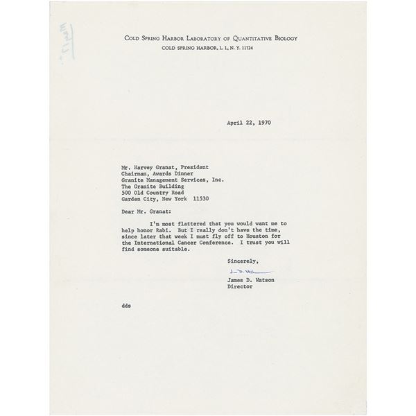 TLS, one page, 8.5 x 11, Cold Spring Harbor Laboratory of Quantitative Biology letterhead, April 22, 1970. Letter to Harvey Granat, in full: "I...