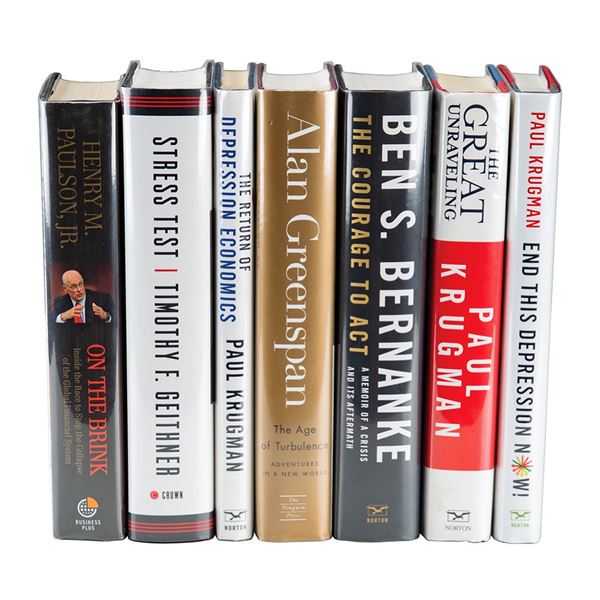 Six first edition books, all hardcover with dust jacket, each signed inside in ink or felt tip by a noted economist, including: Ben S. Bernanke (The C