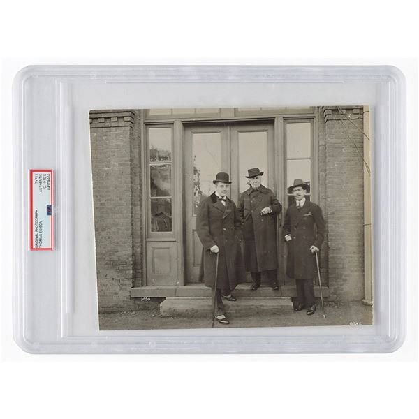 Sharp original vintage circa 1910s glossy 9.25 x 7.5 photograph of Thomas Edison with two dapper gentlemen outdoors, all wearing long overcoats. Inher