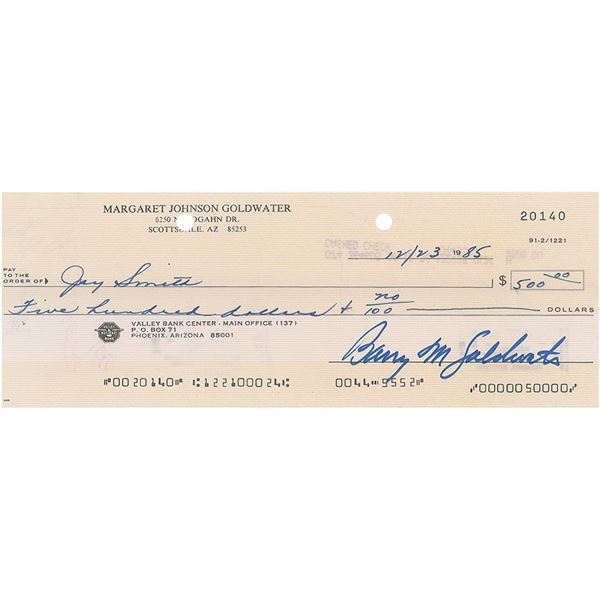 Personal check belonging to his late wife Margaret Johnson Goldwater, 8.25 x 3, filled out in another hand and signed by Goldwater, "Barry M. G...
