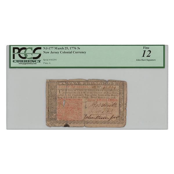 Encapsulated and graded by PCGS Fine 12. Revolutionary War-dated Colonial New Jersey engraved bank note for "Three Shillings," 4 x 2.25, i...