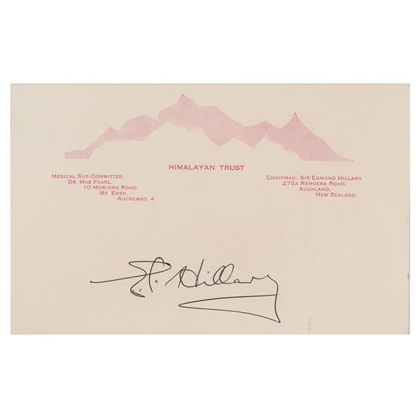Ink signature, "E. P. Hillary,†on an off-white sheet of Himalayan Trust stationery folded to 8 x 5. In fine condition, wit