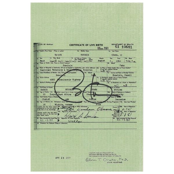 Felt tip signature, "Barack Obama," on a 5.75 x 8.25 page, on which a copy of his 'Certificate of Live Birth' has been printed. In...