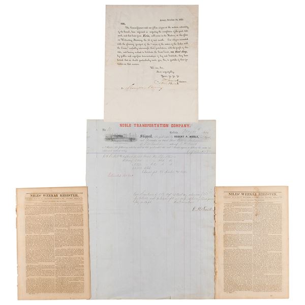 Four items associated with the Erie Canal, highlighted by an official invitation to Chancellor Lansing for its opening in 1825. The invitation is one