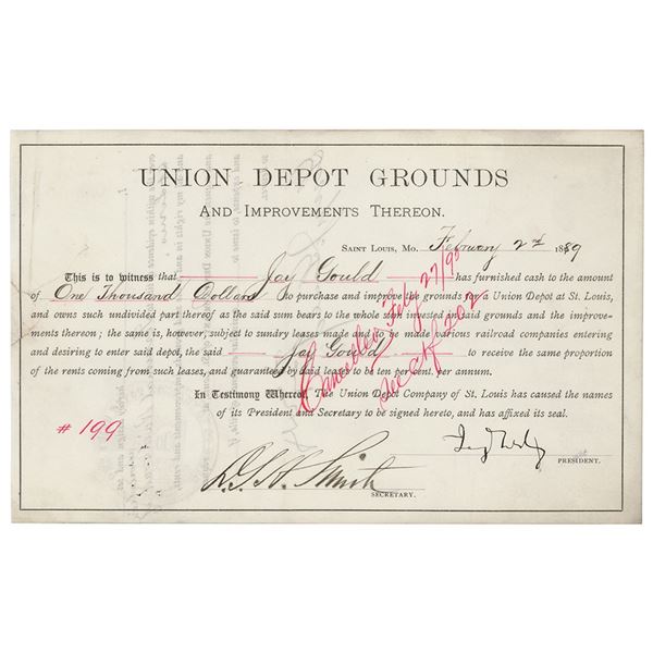Partly-printed DS, one page, 9.25 x 6, February 2, 1889. Union Depot Grounds receipt certifying that "Jay Gould has furnished cash to the amoun...