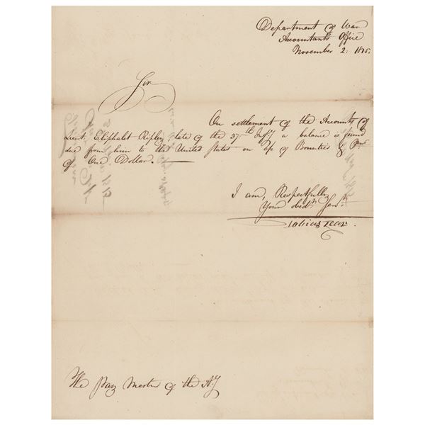 LS, one page, 7.75 x 9.75, November 2, 1815. Letter written on behalf of the "Department of War, Accountant's Office," in part: "...