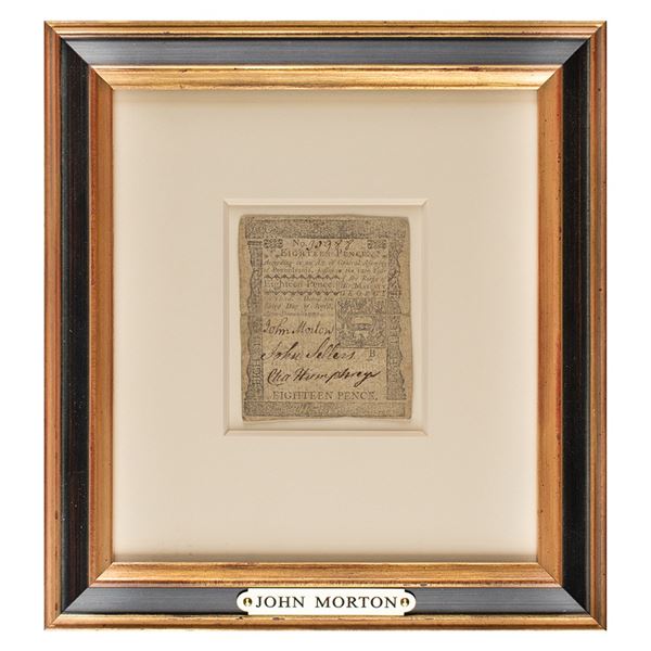 Revolutionary War-dated Colonial New Jersey engraved bank note for "One Shilling," 4 x 2.25, issued as No. 15016, and reading: ‰...