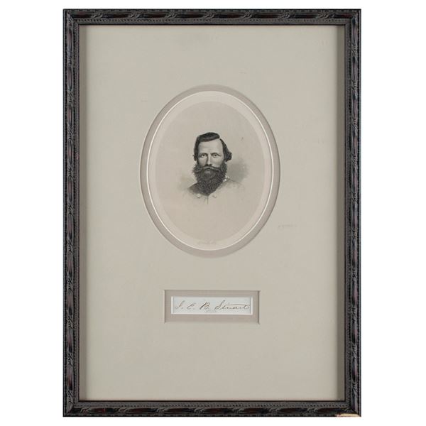 Neat and crisp ink signature, "J. E. B. Stuart,‰Û on an off-white 2.5 x .5 slip, archivally double-matted and framed with an