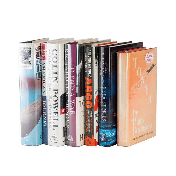 Six hardcover books signed by notable military figures, operatives, and government officials, including: Pappy Boyington (Tonya, inscribed); Antonio M