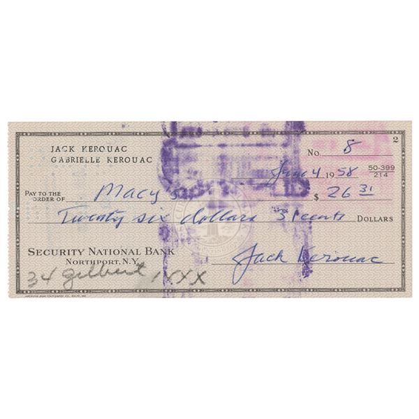 Personal check, 6.25 x 2.75, filled out and signed by Kerouac, "Jack Kerouac," payable to Macy's for $26.31, June 4, 1958. In fine con...