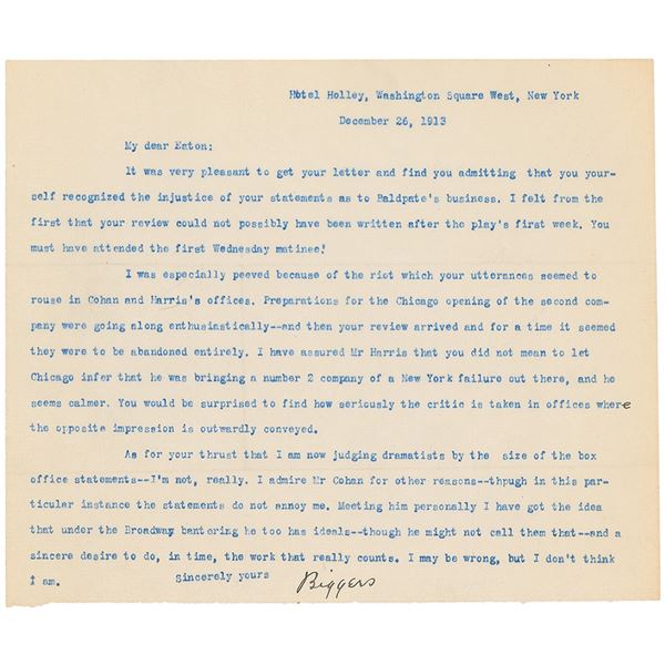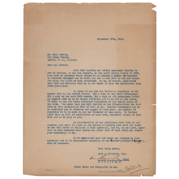 DS, one page, 8.5 x 11, September 27, 1921. Agreement between Noel Coward and Boni & Liveright, Inc., in part: "This will confirm our verba...