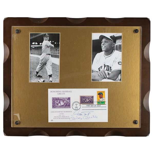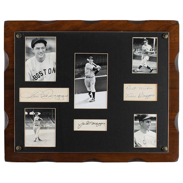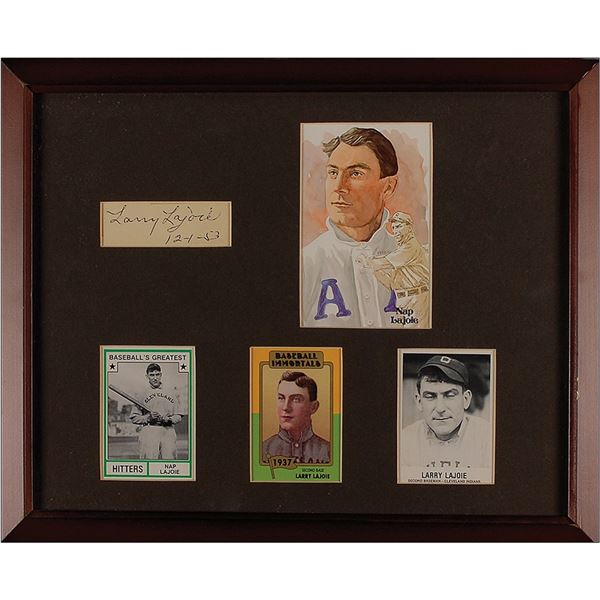 Vintage ballpoint signature, "Larry Lajoie 12-1-53," on an off-white card. Matted and framed with a Perez-Steele card and three trading ca...