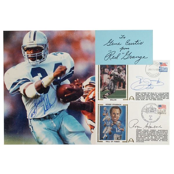 Four items signed by football legends: a felt tip signature and inscription, "To Gene Curtis, from 'Red' Grange," on a blue 5 x 3 ...