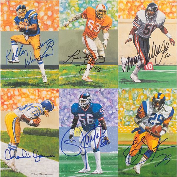 Five sets of Pro Football Hall of Fame Art Series cards made by Goal Line Art, Inc., honoring the HOF classes of 1995 through 1999, with a total of 18