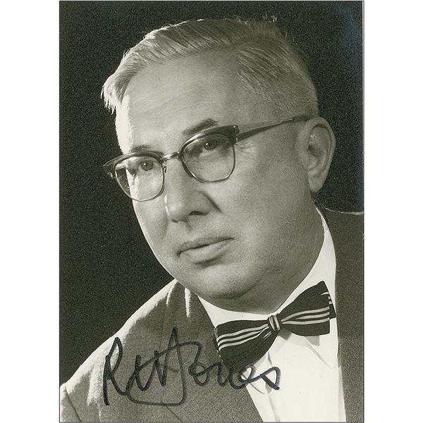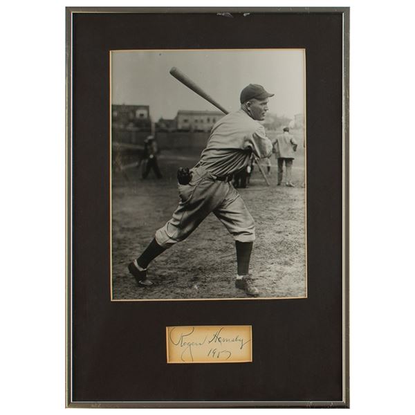 Vintage ballpoint signature, "Roger Hornsby, 1957,†on an off-white 3 x 1.25 sheet. Matted and framed with a photo to an ov