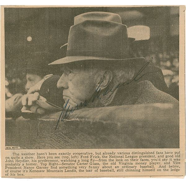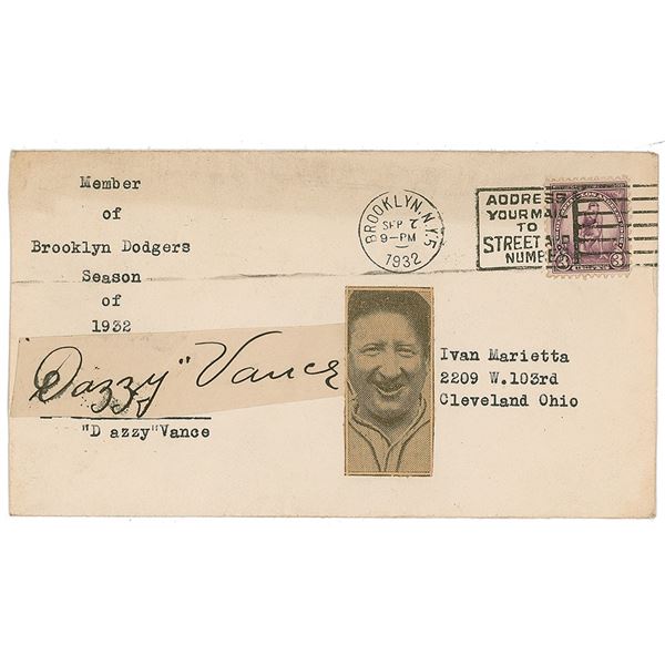 Bold ink signature, "'Dazzy' Vance,†on an off-white 3.25 x .75 slip affixed to a postal cover with attached newspape...