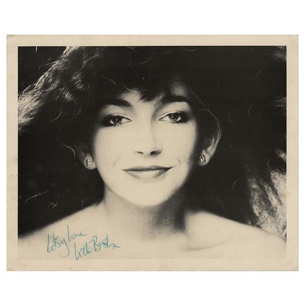 Vintage semi-glossy 10 x 8 cardstock photo of Kate Bush in a lovely up-close pose, signed in blue ballpoint, "Lots of love, Kate Bush, x."...