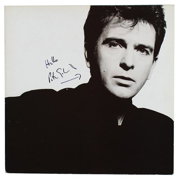 So album by Peter Gabriel, signed on the front cover in black felt tip, "Hello, Peter Gabriel," who draws an arrow to his image. In fine c...
