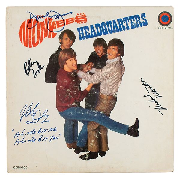 Headquarters album by The Monkees, signed on the front cover in black felt tip by Mike Nesmith and Peter Tork, and in blue felt tip by Davy ("D...