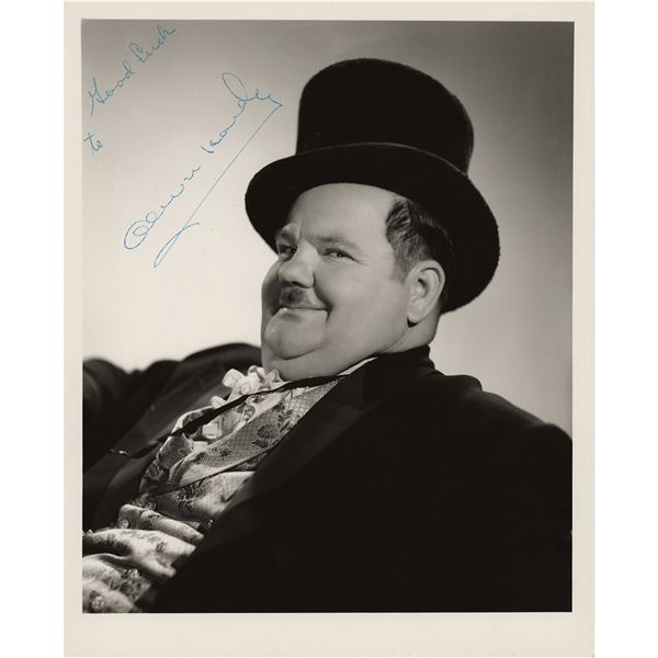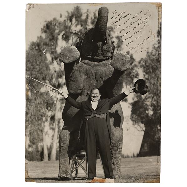 Vintage glossy 9.5 x 12.5 publicity photo of Oliver Hardy as Dr. Tibbett posing below an elephant for the 1939 comedy film Zenobia, signed and inscrib