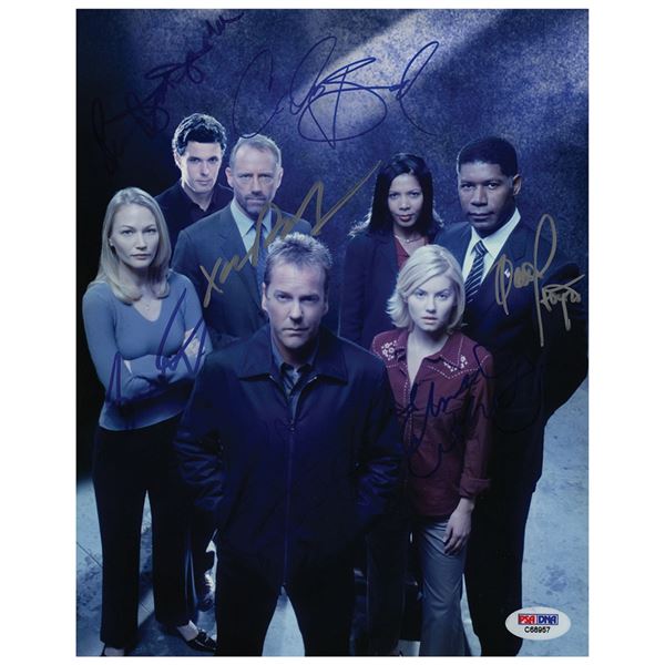 Color glossy 8 x 10 photo of the cast of the action drama television series 24, signed in silver ink and blue felt tip by Kiefer Sutherland, Elisha Cu
