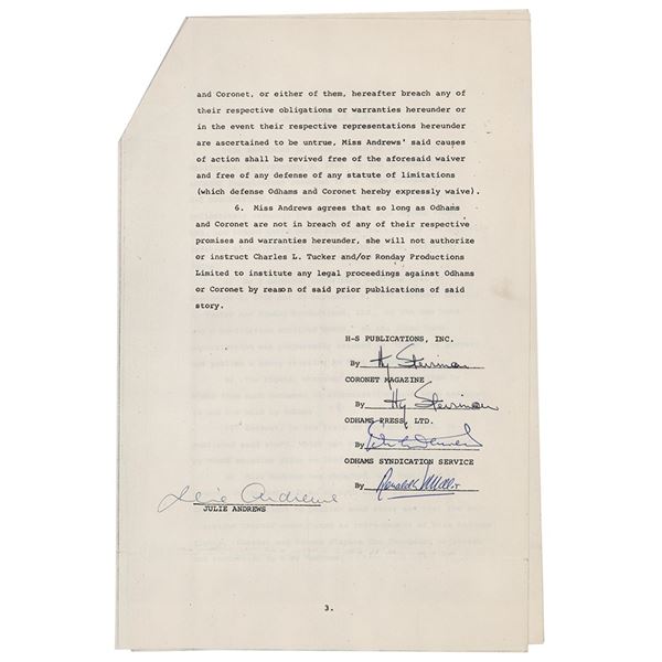 DS, three pages, 8.5 x 13, September 15, 1966. Agreement between Julie Andrews, H-S Publications, Coronet Magazine, and Odhams Press Ltd., in regard t