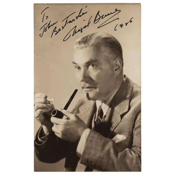 Vintage matte-finish 3.5 x 5.5 photo of Bruce preparing to light a pipe, signed and inscribed in fountain pen, "To John, Best Wishes, Nigel Bru...