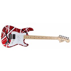 Red-bodied Fender Squier ‘stratocaster-style’ electric guitar, signed on the white pickguard in silver ink. Strips of black and white tape have been a