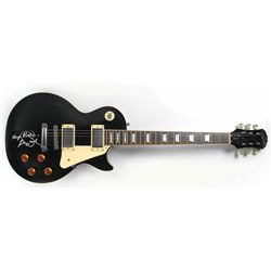Black-bodied Gibson Epiphone Les Paul-model electric guitar, signed on the body in silver ink, “Keep rockin’, Les Paul.” In fine condition, with a bro