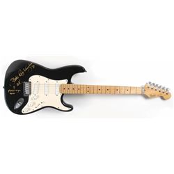 Black-bodied Fender Stratocaster electric guitar, signed on the body in gold ink, “Stevie Ray Vaughan ‘89, O.K.,” with a collector’s notation under th