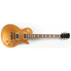 Gold-bodied Gibson USA Les Paul electric guitar, signed on the body in pink ink by Gibbons, adding a pinstriped design to the edges in pink and silver