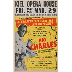 Window card poster for a Ray Charles show at the Kiel Opera House on March 29, 1963, 14 x 22.25, featuring a large image of Charles and a list of the