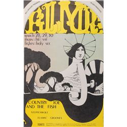 Original color 13.75 x 22 poster for Bill Graham presents Country Joe and the Fish at the Fillmore on March 28–30, 1968. Poster, numbered BG-113, feat