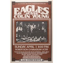 Rare poster for an Eagles show with Jesse Colin Young on April 7, 1974, at UC Santa Barbara’s Robertson Gymnasium, 15.5 x 25.5, featuring a Western-th