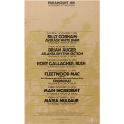 Original 13.25 x 22 color poster for upcoming 1974 shows at the Paramount Northwest in Seattle, Washington. Among the acts listed are Fleetwood Mac (w