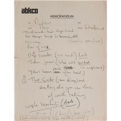 Amazing handwritten list by John Lennon penned in ink on an off-white sheet of 8.5 x 11 ABKCO memorandum sheet, no date but circa late 1969. The list
